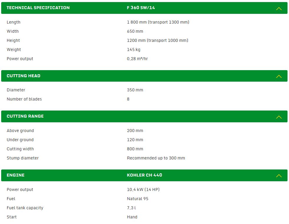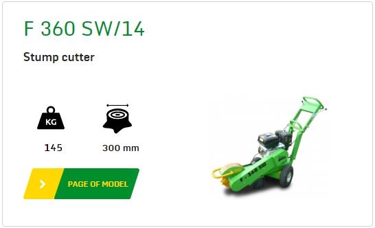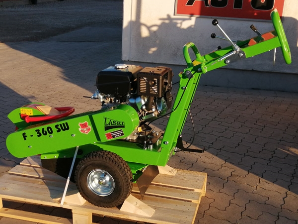 A new light-weight stump cutter LASKI F360 SW is based on our field-proven model LASKI F350. This stump cutter is designed for cutting of above- and under-ground stump parts with unlimited stump diameters (recommended size up to 300 mm). This machine is newly equipped with a swivelling base that facilitates swinging motions of the cutting head essentially. Its braked chassis supports machine stability. Automatic locking of the top section and simple machine control make any work much easier. Its overall width of 650 mm makes also small gardens and narrow sites accessible.
