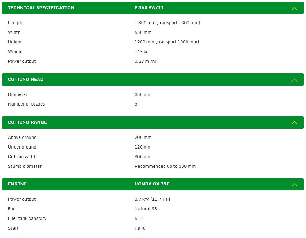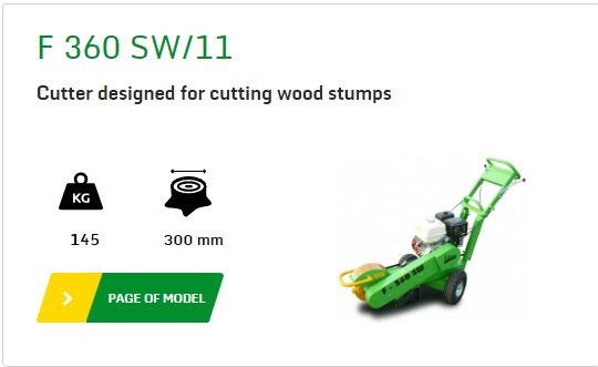 A new light-weight stump cutter LASKI F360 SW is based on our field-proven model LASKI F350. This stump cutter is designed for cutting of above- and under-ground stump parts with unlimited stump diameters (recommended size up to 300 mm). This machine is newly equipped with a swivelling base that facilitates swinging motions of the cutting head essentially. Its braked chassis supports machine stability. Automatic locking of the top section and simple machine control make any work much easier. Its overall width of 650 mm makes also small gardens and narrow sites accessible.