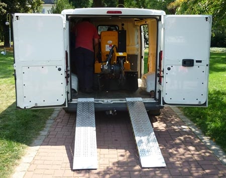 Stump cutter on crawler chassis and sturdy base. Expandable chassis ensures stability of the machine and allows you to work in inaccessible terrain. It si very compact and versatile, Fully hydraulic, Low centre of gravity, Easy and quick maintenance. Control of the whole machine with the RC joystick.