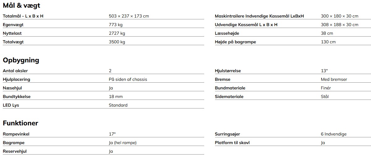 Den solide bund i finer og stærke stålsider giver høj holdbarhed og modstandsdygtighed over for slid og vejrpåvirkninger. Den hele bagrampe gør af- og pålæsning nem og effektiv, mens den integrerede platform til skovl optimerer plads og lastfordeling under transport.
