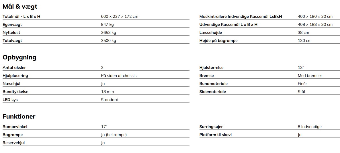 Traileren har en standard totalvægt på 3500 kg. men kan bestilles med totalvægte fra 2700 kg. alt efter behov og anvendelse.