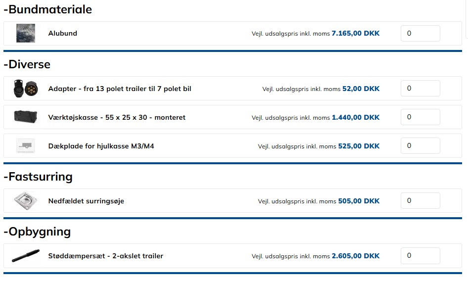 Traileren kan konfigureres med off-road hjul, som giver bedre fremkommelighed i ujævnt terræn, og sort fælg, der tilføjer et moderne udtryk. Den kan udstyres med en værktøjskasse, som giver ekstra opbevaringsplads til udstyr og værktøj, samt et støddæmpersæt, der forbedrer kørekomforten og stabiliteten under transport.