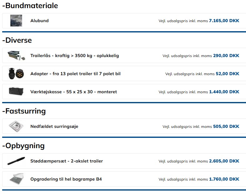 Traileren kan konfigureres med en værktøjskasse til opbevaring af remme, kæder og andet udstyr, samt et støddæmpersæt, der forbedrer komforten og stabiliteten under transport.